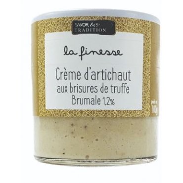 Composition : Fonds d'artichauts 49,4%, crème 29,6% (stabilisant: Carraghenanes), eau, fécule de pomme de terre, brisures de truffe Tuber Brumale 1,2%, sel, arôme naturel saveur truffe.